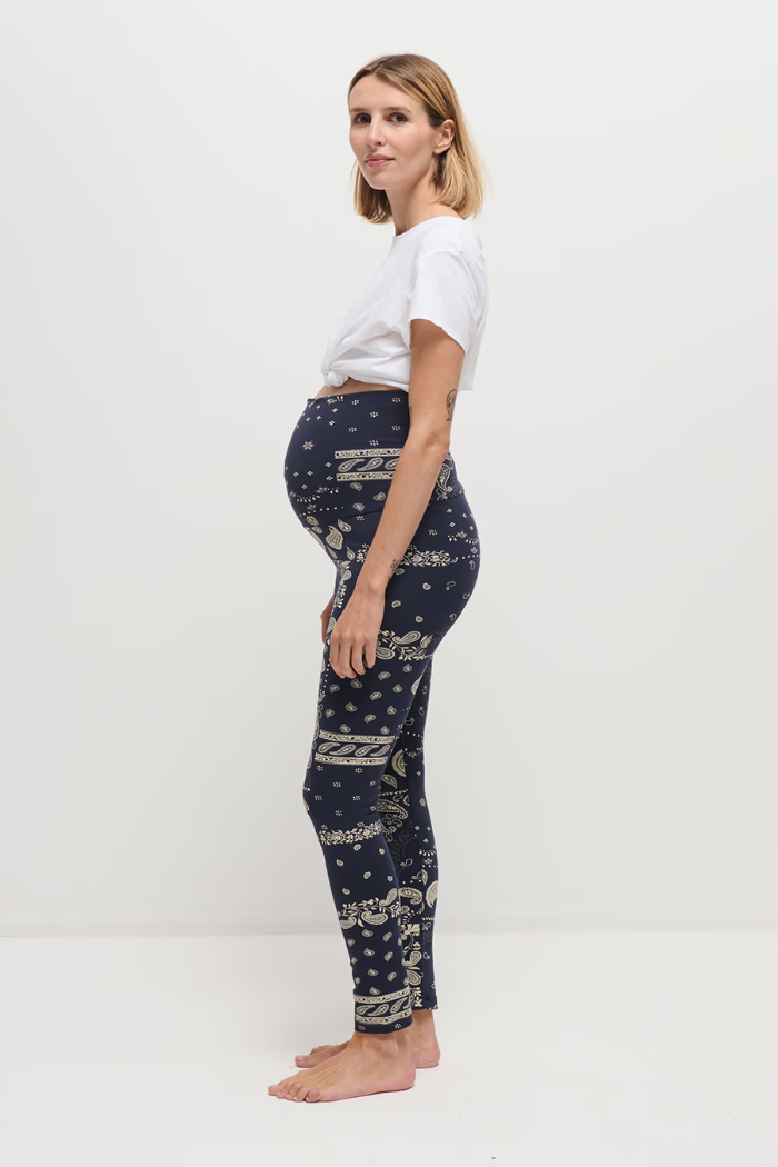 Adoptez ce legging de grossesse bleu marine à imprimé bandana, pensé pour suivre l’évolution de votre silhouette tout en douceur. Sa matière stretch en coton bio assure confort et maintien, que vous soyez enceinte ou non.